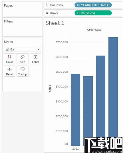 请注意,数据是按年份汇总的,并且会显示列标题。Sales度量汇总为一个总和,并创建一个轴,而列标题移到视图的底部。由于您添加了日期维度,因此Tableau使用“线”作为标记类型。